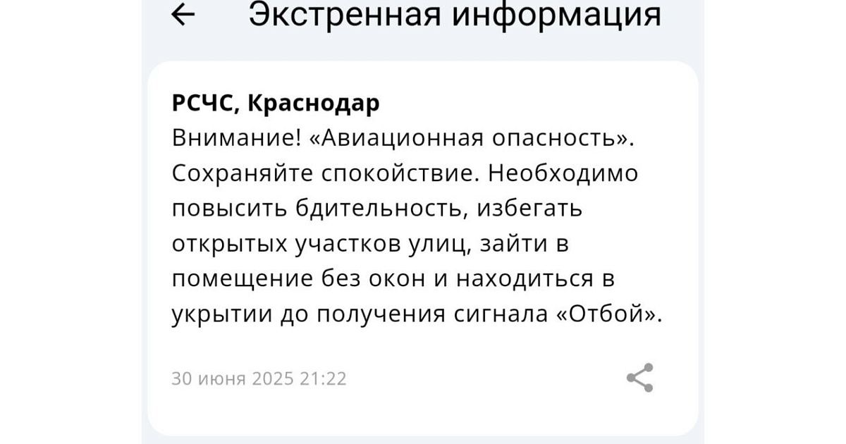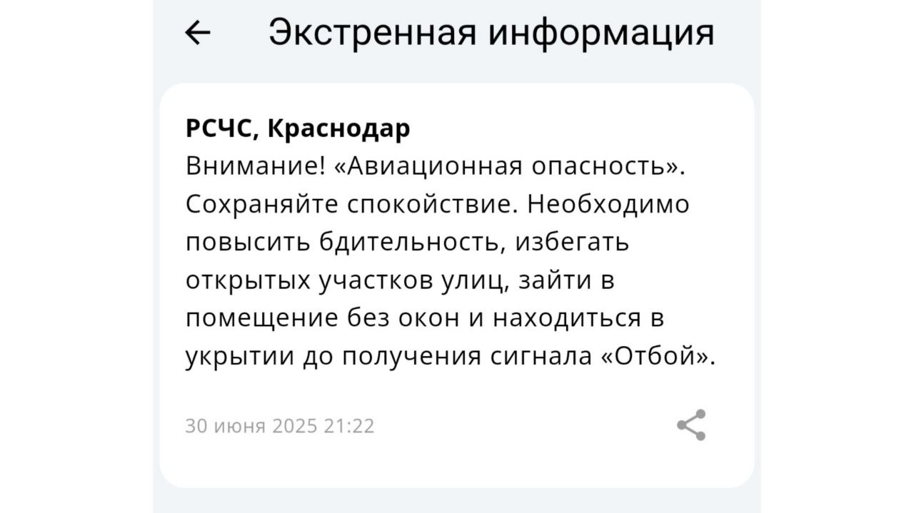 В Краснодарском крае вечером 30 июня была объявлена авиационная опасность. Жители региона получили оповещения от Единой государственной системы предупреждения и ликвидации чрезвычайных ситуаций.