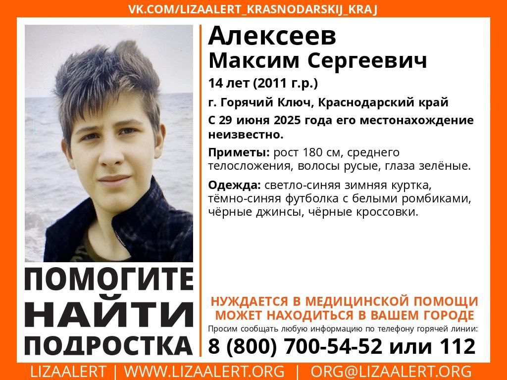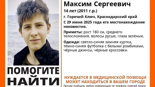 В Горячем Ключе пропал 14-летний Максим Алексеев. С 29 июня местонахождение остается неизвестным.