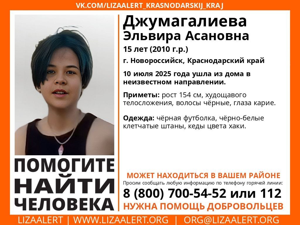 В Новороссийске пропала без вести 15-летняя Эльвира Джумагалиева. Волонтеры «Лиза Алерт» рассказали, что подросток ушла из дома в неизвестном направлении 10 июля.
