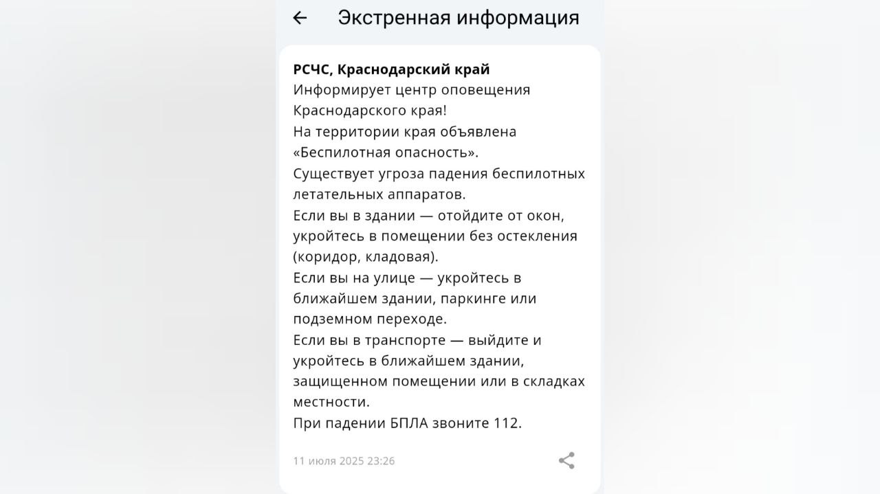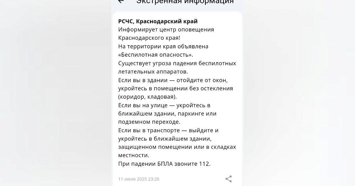 На всей территории Краснодарского края в ночь на 12 июля был введён режим «Беспилотная опасность». Власти предупредили жителей региона о высокой вероятности атак с использованием беспилотных летательных аппаратов.