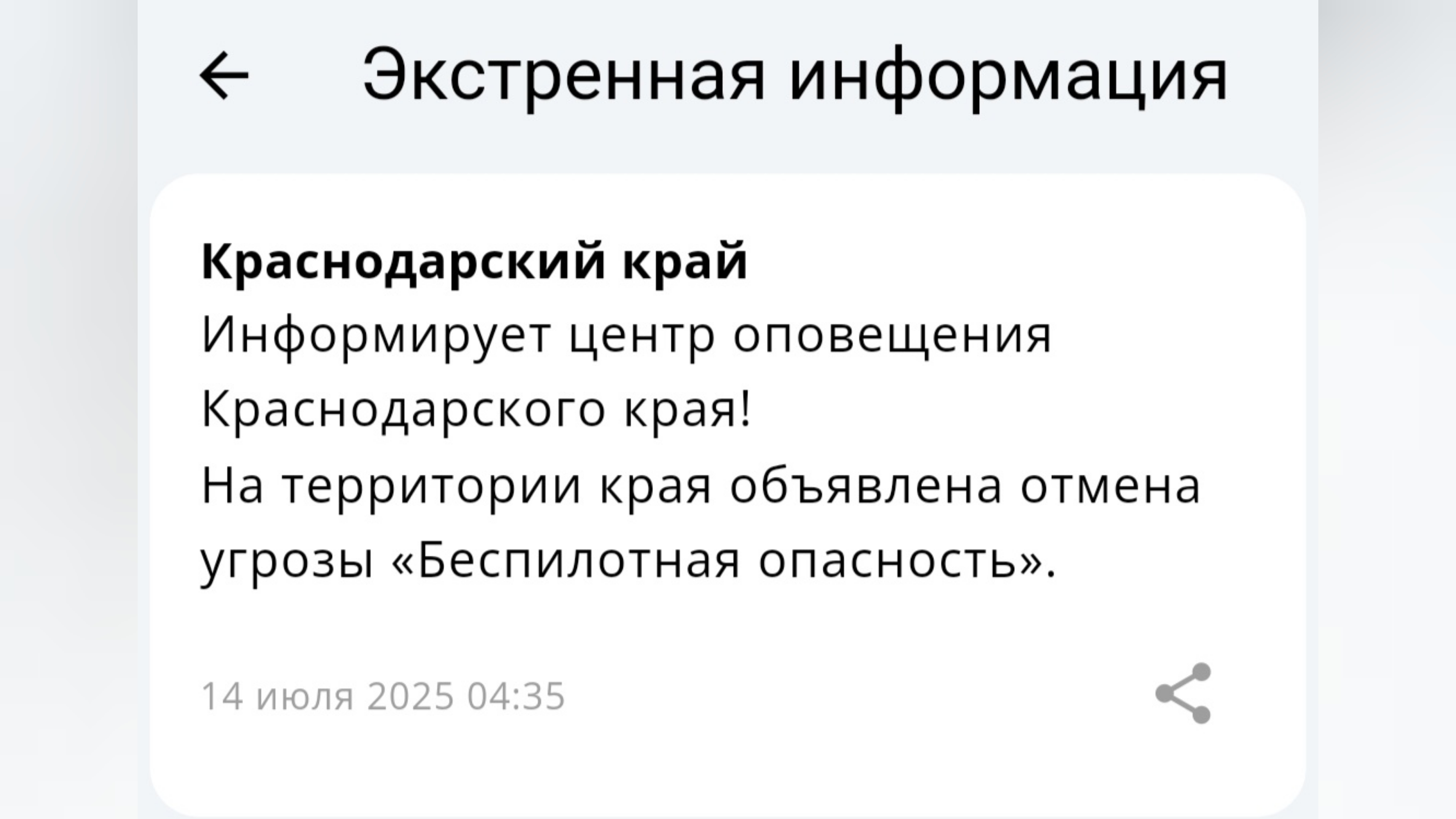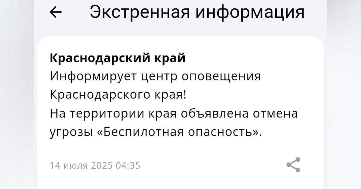 – На территории края объявлена отмена угрозы «Беспилотная опасность», – сообщил центр оповещения Краснодарского края.