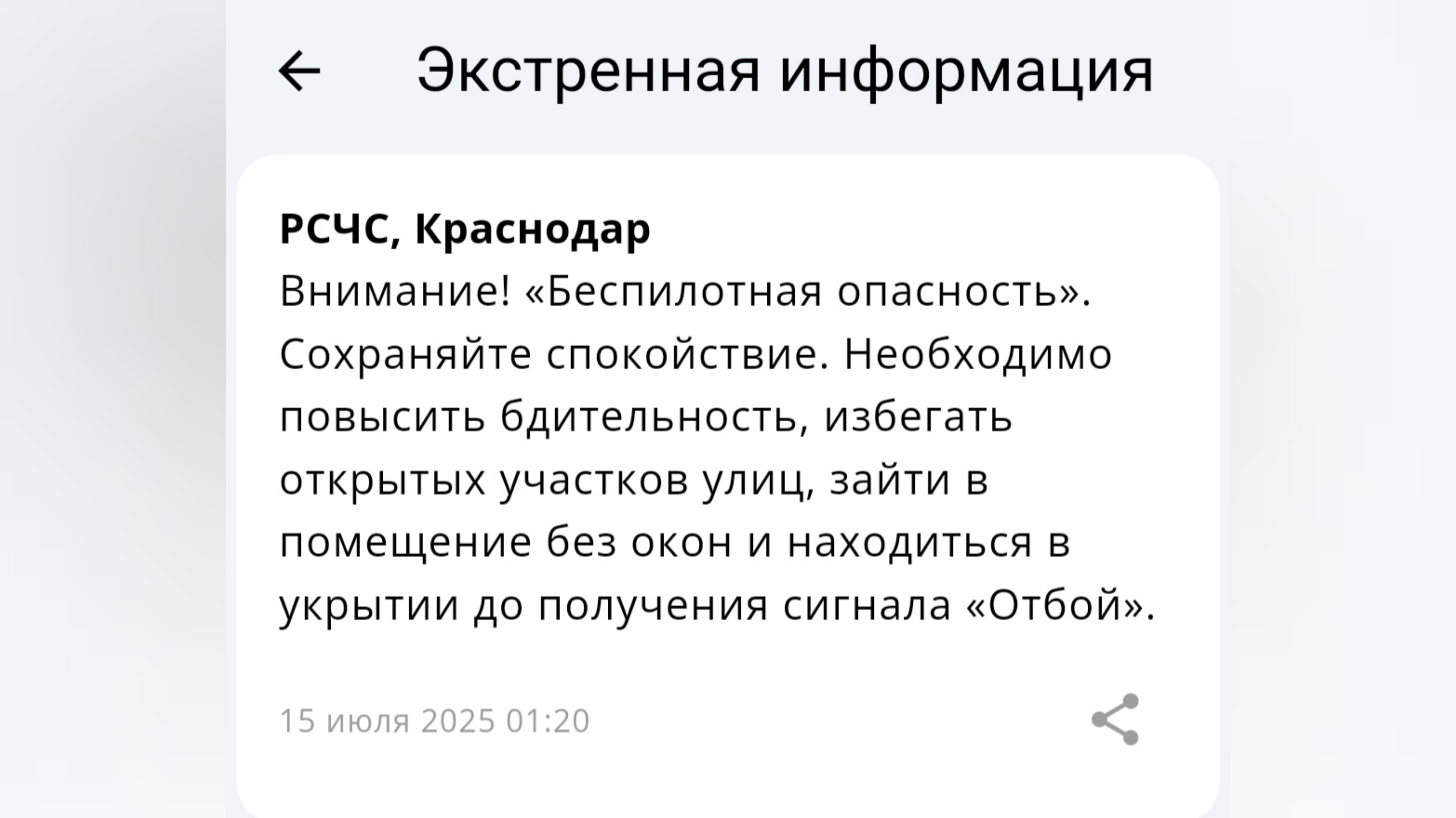 В ночь на 15 июля в Краснодарском крае ввели беспилотную опасность. Единая государственная система предупреждения и ликвидации чрезвычайных ситуаций разослала населению сообщения с рекомендациями действий.