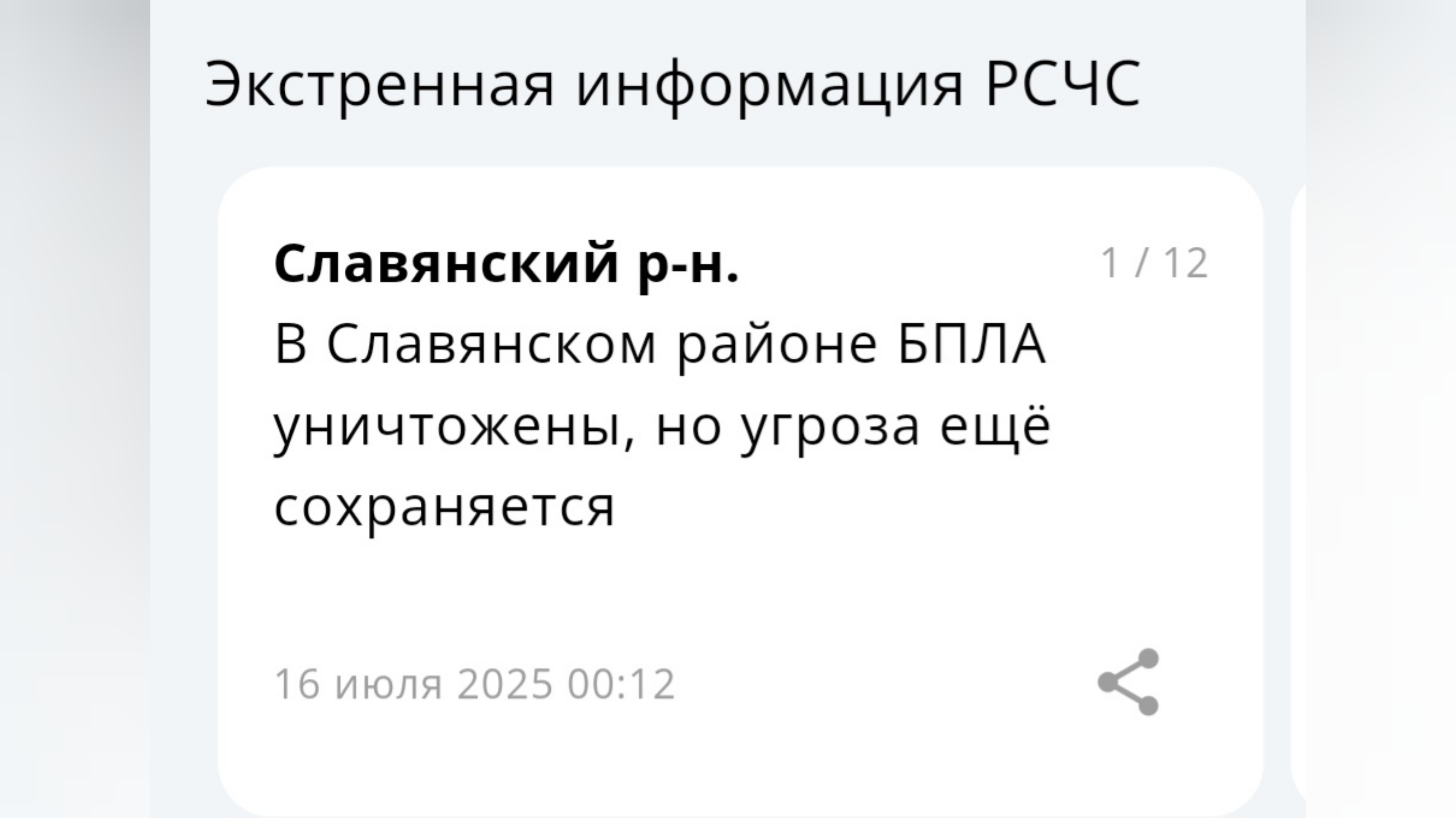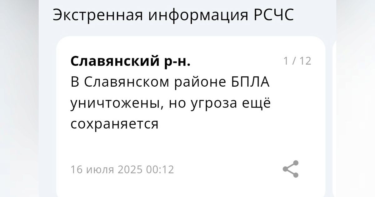 – Экстренная информация РСЧС. В Славянском районе БПЛА уничтожены, но угроза ещё сохраняется, – уточнили в центре оповещения.