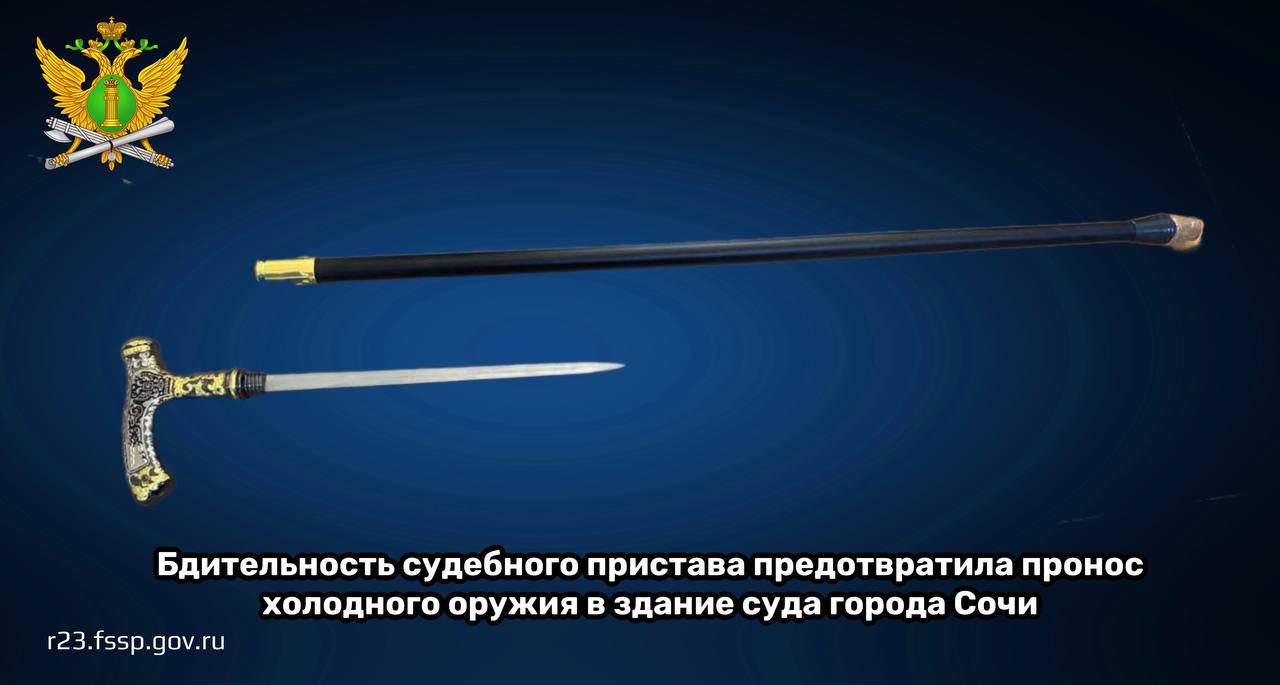 В Сочи судебный пристав предотвратил пронос оружия в здание суда. При досмотре одного из посетителей Адлерского районного суда привлекла внимание трость. Внутри нее был спрятан клинок.