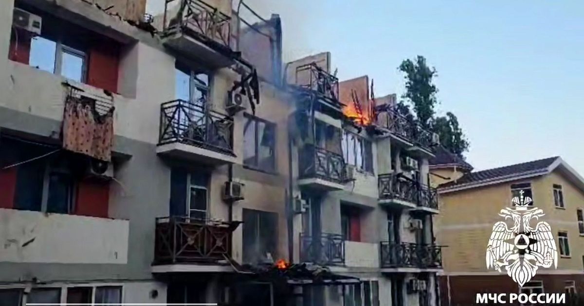 Работы по тушению пожара в четырехэтажном доме в Сочи показало МЧС России. На кадрах видно, что деревянный мансардный этаж выгорел полностью, а также пострадали балконы и нижние этажи здания.