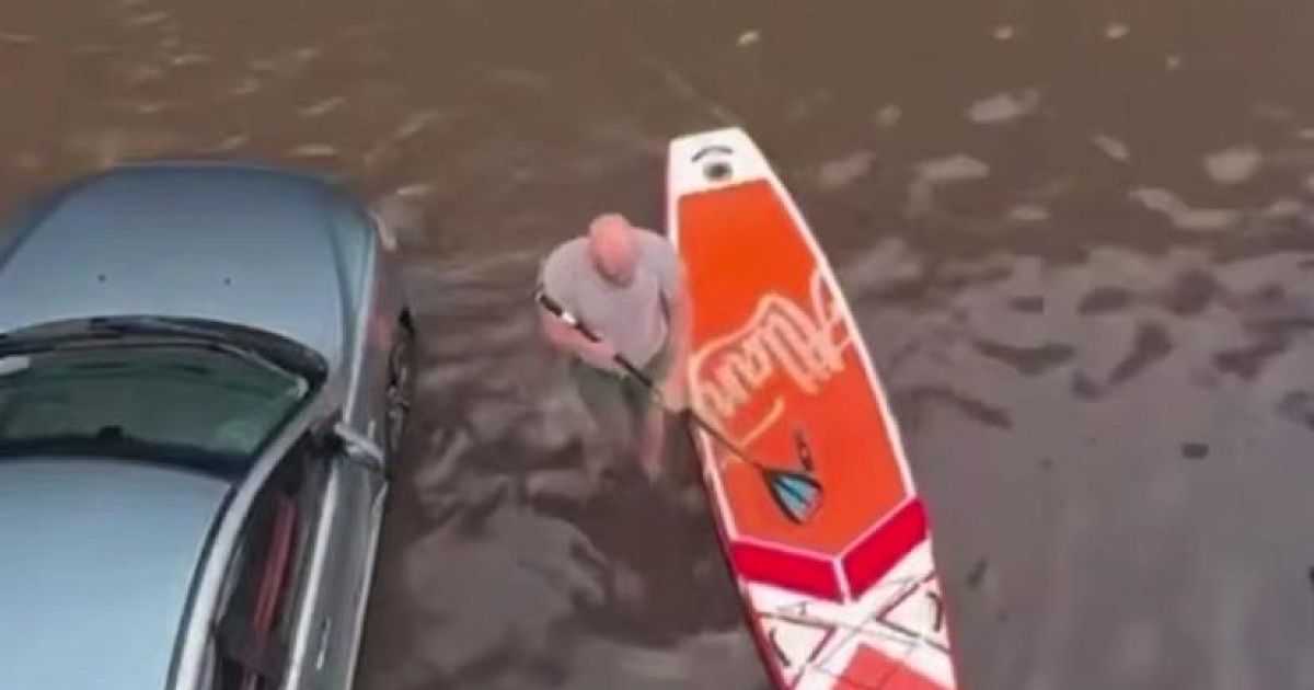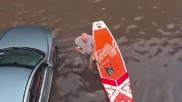 Уточним, что мужчина был одет по-пляжному: шлепки, шорты, висло и плавсредство, передвигающееся по коричневого цвета «воде».