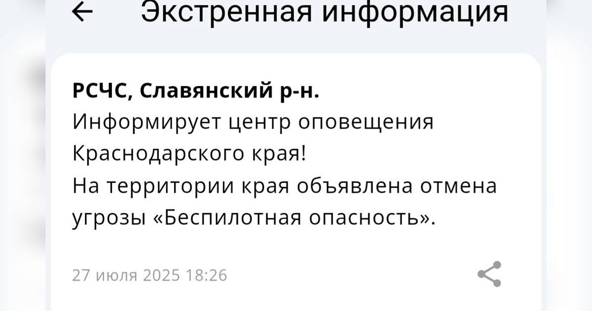 – Центр оповещения Краснодарского края сообщает об отмене режима «Беспилотная опасность» на всей территории региона, – говорилось в сообщении.