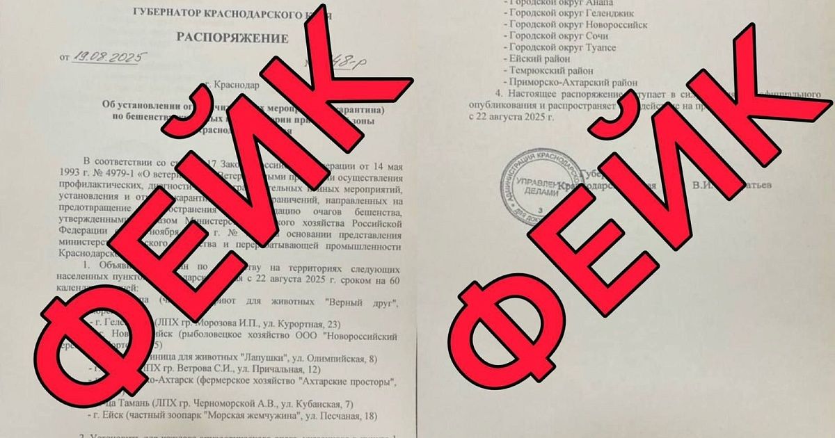 В социальных сетях распространилось сообщение о якобы подписанном губернатором Краснодарского края распоряжении о введении карантина по бешенству животных в прибрежной зоне с 22 августа 2025 года. В оперштабе региона эту информацию назвали недостоверной.