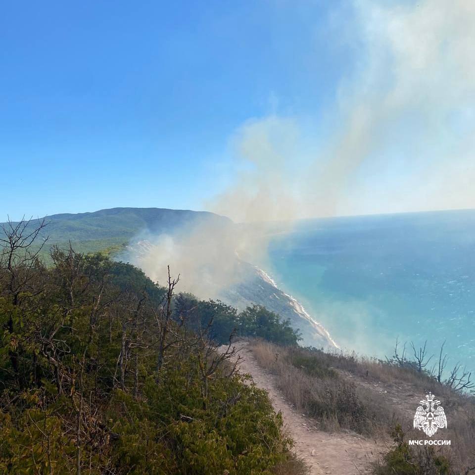 Для тушения огня задействованы 23 сотрудников МЧС и 7 единицы техники. Спасатели отмечают, что работа осложняется жаркой погодой и гористой местностью.