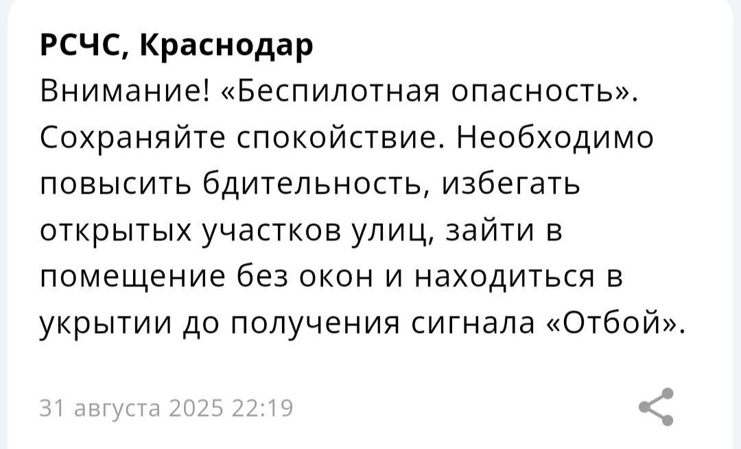 На Кубани и краевом центре поздним вечером 31 августа введён режим «Беспилотная опасность». Сообщение с рекомендациями находиться в укрытии разослали РСЧС. Жителей города призвали сохранять спокойствие и быть бдительными.