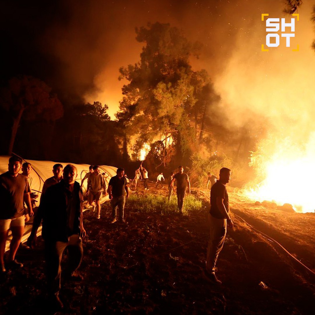 В Сеть выложили кадры эвакуации российских туристов из горящего отеля в Анталье, Турция. Уточняется, что из-за возгорания в лесу пожар достиг большой площади, пишет Телеграм-канал Shot.