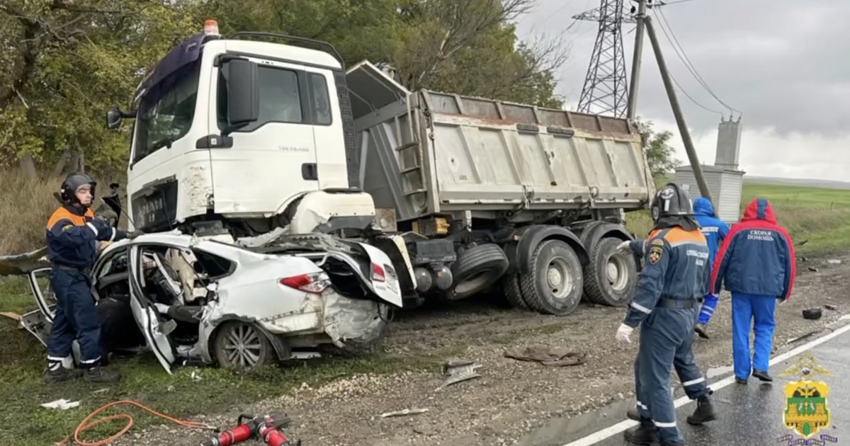 Трагедия произошла днем 13 октября около 13:50 на автодороге «Новороссийск — Керчь» неподалеку от хутора Тарусино. По предварительным данным, водитель автомобиля Nissan Almera не справился с управлением на повороте, выехал на встречную полосу и столкнулся с самосвалом MAN.
