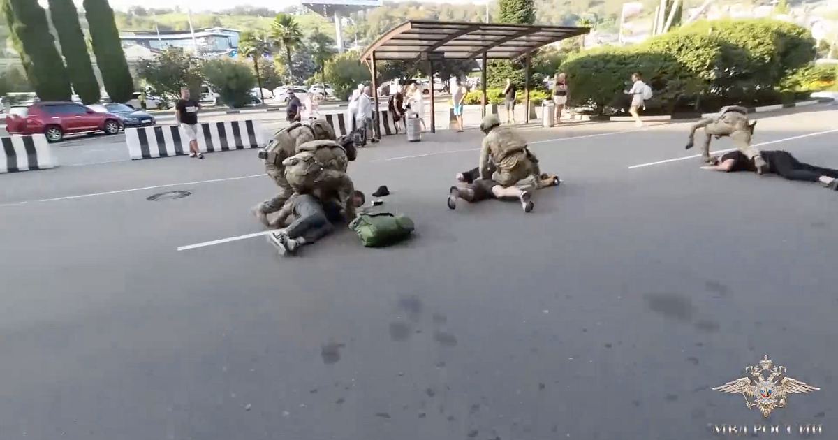 На кадрах видно, как силовики в масках высаживаются из микроавтобуса у входа в аэропорт Сочи и проводят задержание. В операции участвовали сотрудники МВД и Росгвардии. Вместе с организатором были задержаны россияне, которых он собирался вывезти за границу.