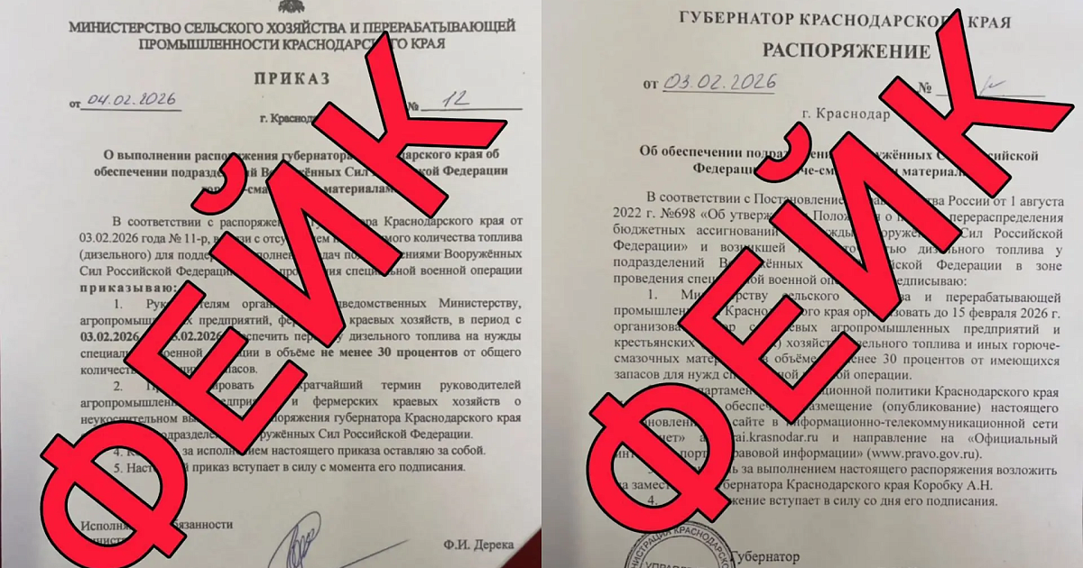 По данным оперштаба, администраторам телеграм-каналов и редакциям СМИ направляют поддельные «распоряжение» губернатора края и «приказ» и.о. министра сельского хозяйства и перерабатывающей промышленности Федора Дереки. Власти подчеркнули, что таких документов не существует.