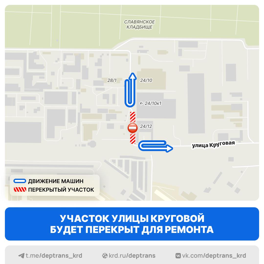 В Краснодаре временно перекроют движение на участке улицы Круговой в связи с проведением ремонтных работ. С 25 июня по 16 июля будет закрыт для проезда отрезок от дома № 24/12 до дома № 24/10к1.
