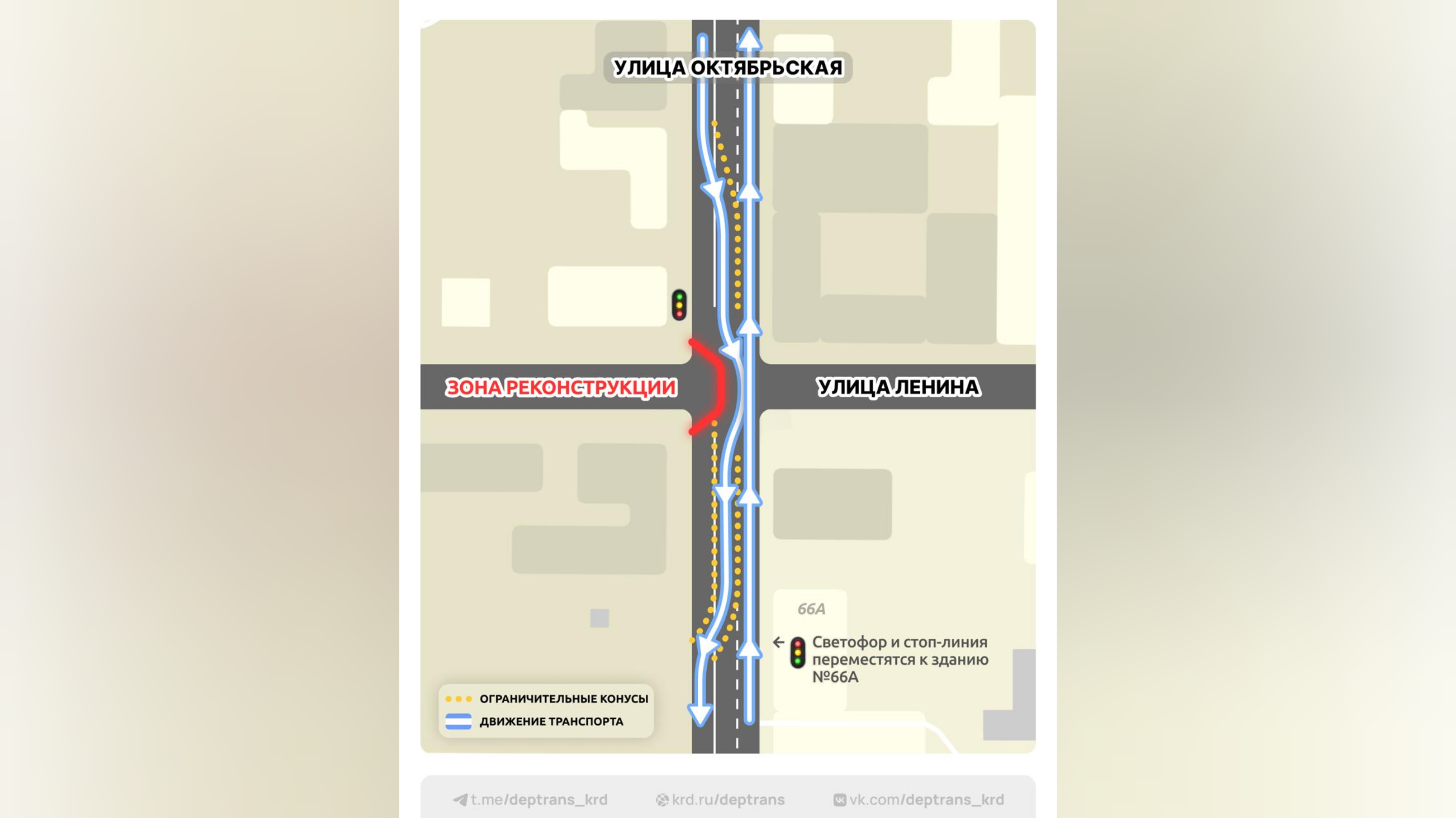 – Чтобы сохранить проезд, по крайней правой полосе в сторону улицы Северной введут реверсивное движение. Для этого светофор и стоп-линию в этом направлении временно перенесут ближе к дому №66А, – сообщили в Департаменте транспорта и дорожного хозяйства Краснодара.