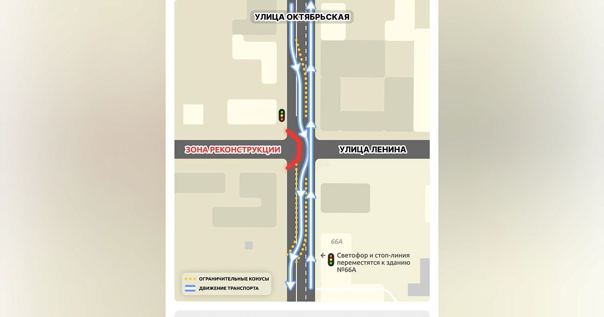 В период с 23:00 11 августа до 5:00 27 августа на пересечении Октябрьской улицы и улицы Ленина будет временно закрыта одна полоса для движения. На улице идет ремонт коллекторной системы. Рабочим предстоит заменить участок коллектора и установить новые смотровые колодцы.