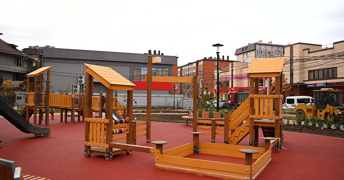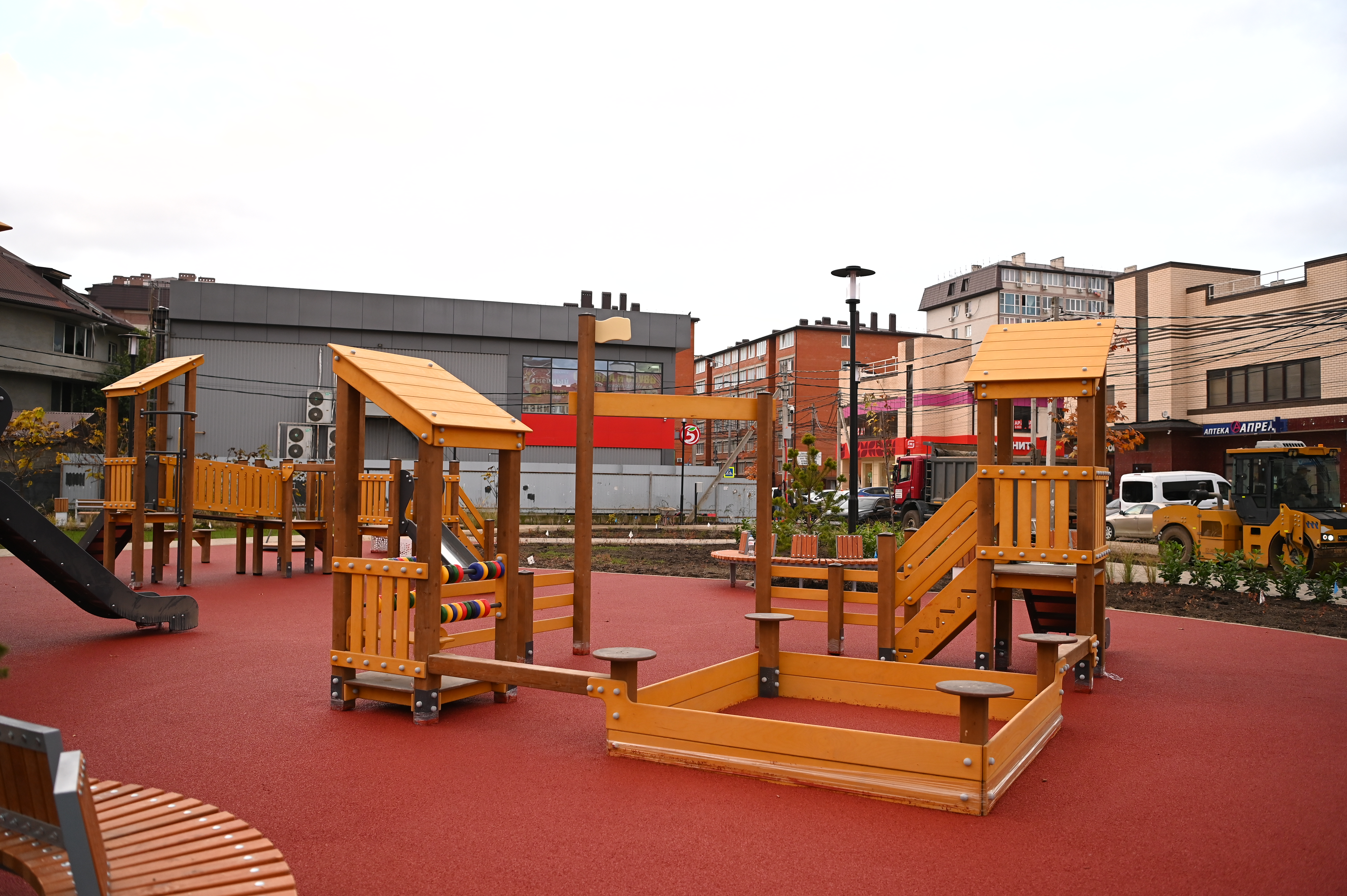 В сквере уже уложена тротуарная плитка, установлены бордюры и камеры видеонаблюдения, проведено освещение. Для отдыхающих оборудованы детская и спортивная площадки с резиновым покрытием, установлены скамейки и урны. Высажено 26 деревьев и более 2 тысяч кустарников, работает система автоматического полива.